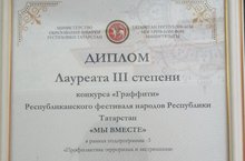 Поздравляем лауреатов III степени конкурса "Граффити" Республиканского фестиваля народов Республики Татарстан "Мы вместе" в рамках Подпрограммы-3 "Профилактика терроризма и экстремизма" учащихся 8А класса Анастасию Мхххх, Анну Ахххх и учащуюся 10Б класса Арину Бхххх! Желаем Творческих побед!!! Учитель Галимова Лилия Фоатовна.