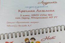 3Б сыйныф укучысы Ангелина Кхххх "Кәгазь әкият"секциясендә Бөек Ватан сугышында Җиңүнең 75 еллыгына багышланган эшләр конкурсында лауреат дипломы белән бүләкләнде.