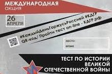 26 апреля состоится традиционная Международная акция "Тест по истории Великой Отечественной войны", направленная на популяризацию отечественной истории, формирование национальной идентичности молодежи России, историческое просвещение граждан России, соотечественников, проживающих за рубежом, а также иностранных граждан. В преддверии Дня Победы всем желающим будет предложено проверить свои знания о самом трагическом периоде истории человечества: ответить на 40 вопросов в течение 40 минут. К каждому вопросу предлагается 4 варианта ответа. Акция проводится Молодежным парламентом при Государственной Думе. Официальным партнером проекта является Российское военно-историческое общество.