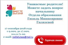 Уважаемые родители и законные представители учащихся МБОУ "Уруссинская средняя общеобразовательная школа №3"! 17 сентября 2018 года с 9.00 до 17.00 начальник Отдела образования Исполнительного комитета Ютазинского муниципального района Республики Татарстан Гюзель Миннеяровна Гилязева ответит на Ваши вопросы, касающиеся обучения и воспитания обучающихся.Телефон горячей линии: 2-71-00.