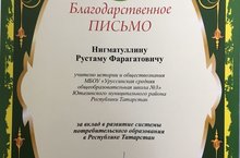 Благодарственным письмом Госалкогольинспекции Республики Татарстан награжден Нигматуллин Рустам Фарагатович, учитель истории и обществознания, за вклад в развитие системы потребительского образования в Республике Татарстан.
