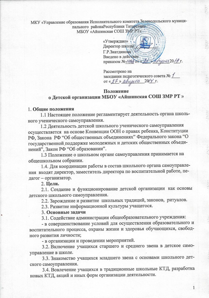 Положение о детской организации "Айшинская СОШ ЗМР РТ"
