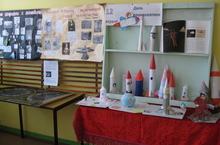 В честь годовщины этого знаменательтного события в школе была организована содержательная выставка. Здесь представлены конкурсные работы учащихся 7-8 классов. Они с увлечением и с большим интересом выполняли свои проектные работы- модели космических кораблей.Некоторые из них даже взлетают!