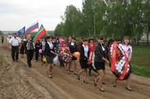Как в былые времена, когда всех детей страны собирало в свой состав пионерское движение, сегодня учащиеся совместно с учительским коллективом нашей школы с патриотическими песнями, флагами, шарами в руках направились на торжественный митинг. Впереди колонны учащиеся несли венки - скромный знак памяти и благодарности павшим солдатам. Все школьники подошли к этому очень ответственно, выучили песни, которые исполняли воодушевлённо под аккомпанемент учителей - баянистов нашей школы - Назырова Ильгиза Султановича и Сафиуллина Дамира Габдулхаевича.