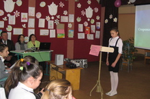 Команда нашей школы, команда Майка Джексона, показала интнресную программу. Каждый участник представлял собой планету солнечной системы. Менеджер по галактике пришел к Солнцу с просьбой, чтобы оно устроило парад, где планеты могли бы показать свои достопримечательности. Самую младшую планету, Плутон, представлял ученик 1 класса Андрюша Зинович.