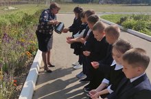 Акция барышында мәктәбебез укучыларының һәрберсе, сулы касәдән кулларына бераз су җыеп, гаепсез һәлак булганнарның якты истәлегенә гөлләргә су сипте.