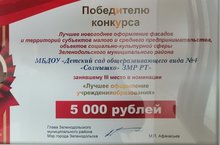 Муниципальный конкурс «Лучшее новогоднее оформление фасадов и территорий» ЗМР РТ/ ТР ЗМР» фасадларны һәм территорияләрне иң яхшы Яңа ел бизәлеше " муниципаль конкурсы 10.01.2022 Ежегодно наш детский сад принимает активное участие в конкурсе «Лучшее новогоднее оформление фасадов и территорий» в этом году Учреждение заняло почетное 3 место в номинации «Лучшее оформление учреждения образования». Спасибо организаторам конкурса.