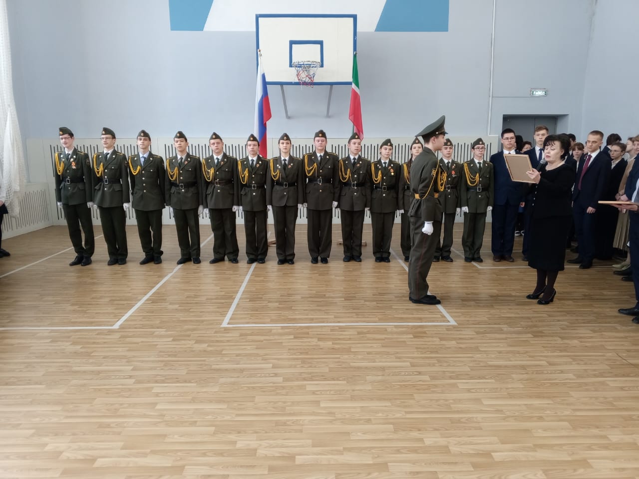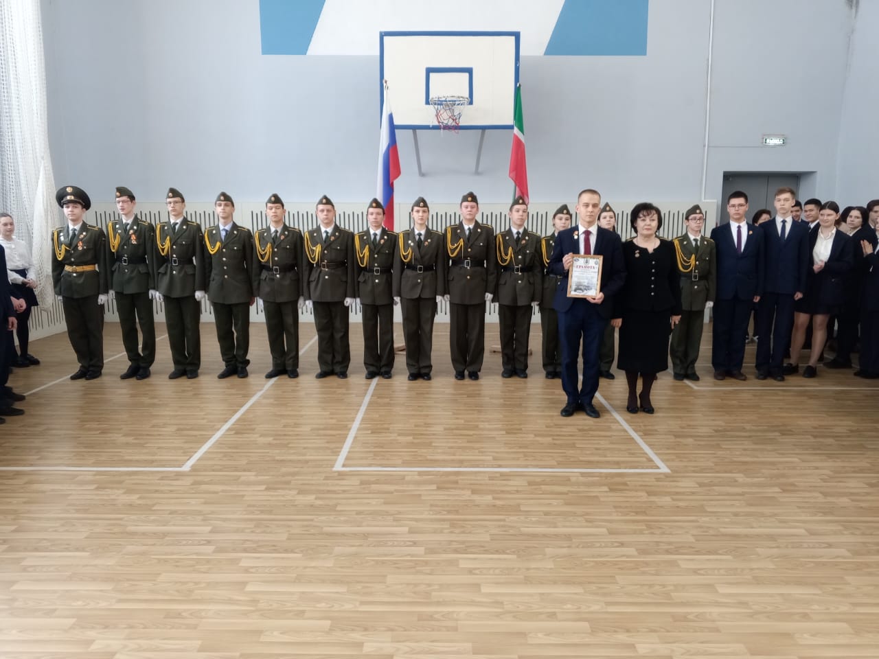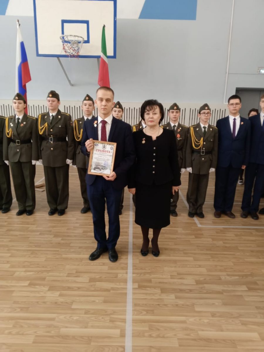 Традиционно поздравили призеров конкурсов: Тагирова А., ученика 8 класса, Адиатуллину С., ученицу 9 класса, Романова М., ученика 8 класса - победителей смотра-конкурса строя и песни "Статен в строю, силён в бою" среди юнармейских отрядов Зеленодольского муниципального района; Аглуллина Д., ученика 10 класса, капитана команды, занявшей 1 место в соревнованиях "Снайперская дуэль с элементами выживания", посвященных годовщине вывода советских войск из Афганистана и Дню Защитника Отечества.