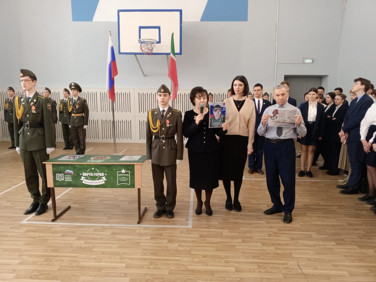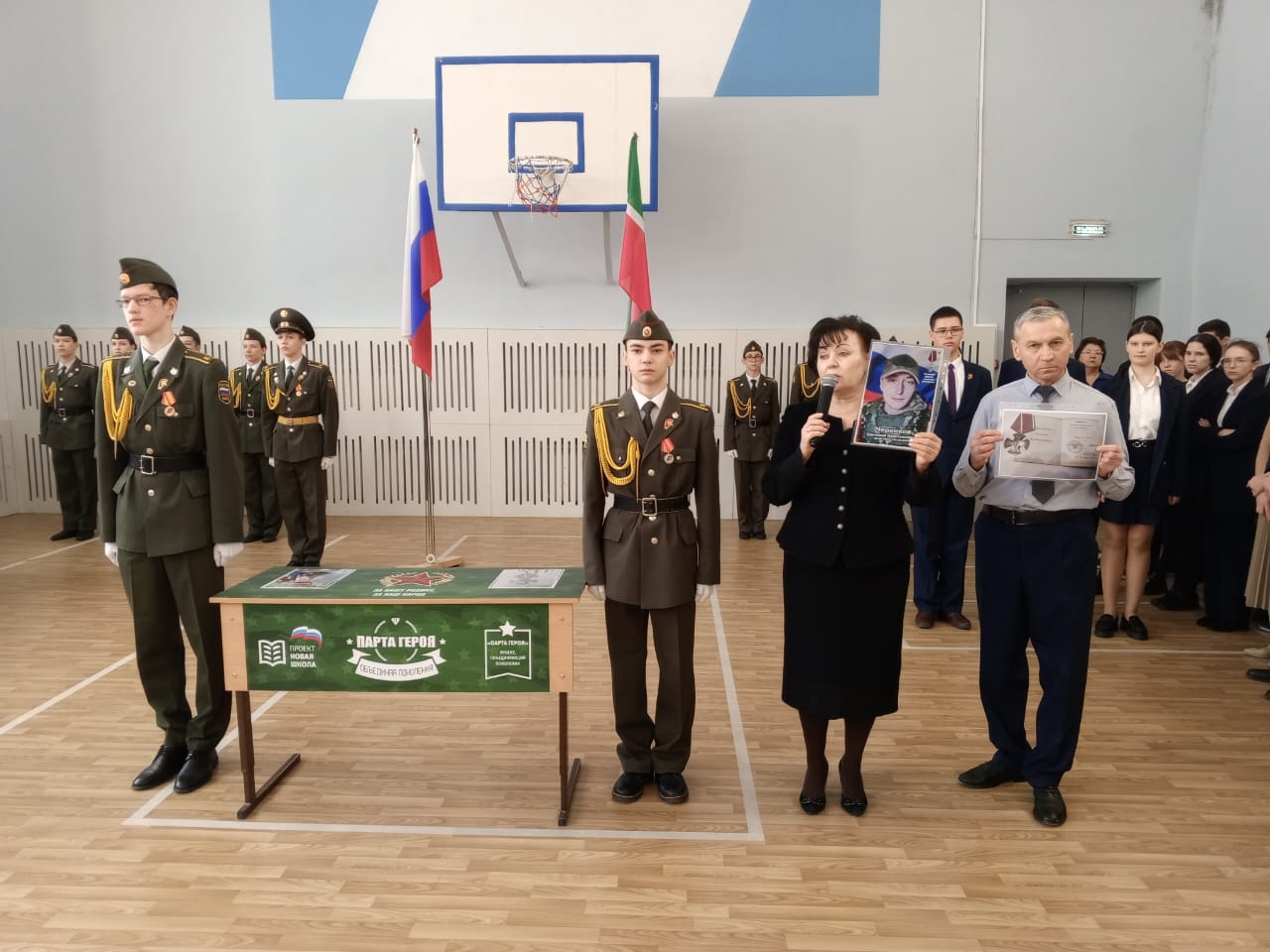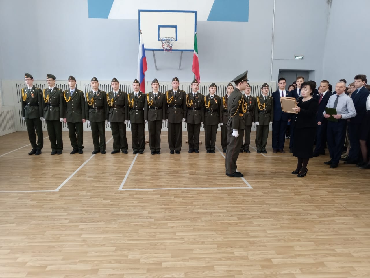 Традиционно поздравили призеров конкурсов: Тагирова А., ученика 8 класса, Адиатуллину С., ученицу 9 класса, Романова М., ученика 8 класса - победителей смотра-конкурса строя и песни "Статен в строю, силён в бою" среди юнармейских отрядов Зеленодольского муниципального района; Аглуллина Д., ученика 10 класса, капитана команды, занявшей 1 место в соревнованиях "Снайперская дуэль с элементами выживания", посвященных годовщине вывода советских войск из Афганистана и Дню Защитника Отечества.