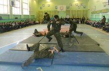 Отрядом "Курс" были организованы показательные выступления для учащихся 1-4 классов. Курсанты продемонстрировали приемы рукопашного боя, разборку и сборку оружия, оказание первой помощи. Наверняка каждый мальчишка в этот момент мечтал быть таким же сильным и смелым защитником мирных граждан.