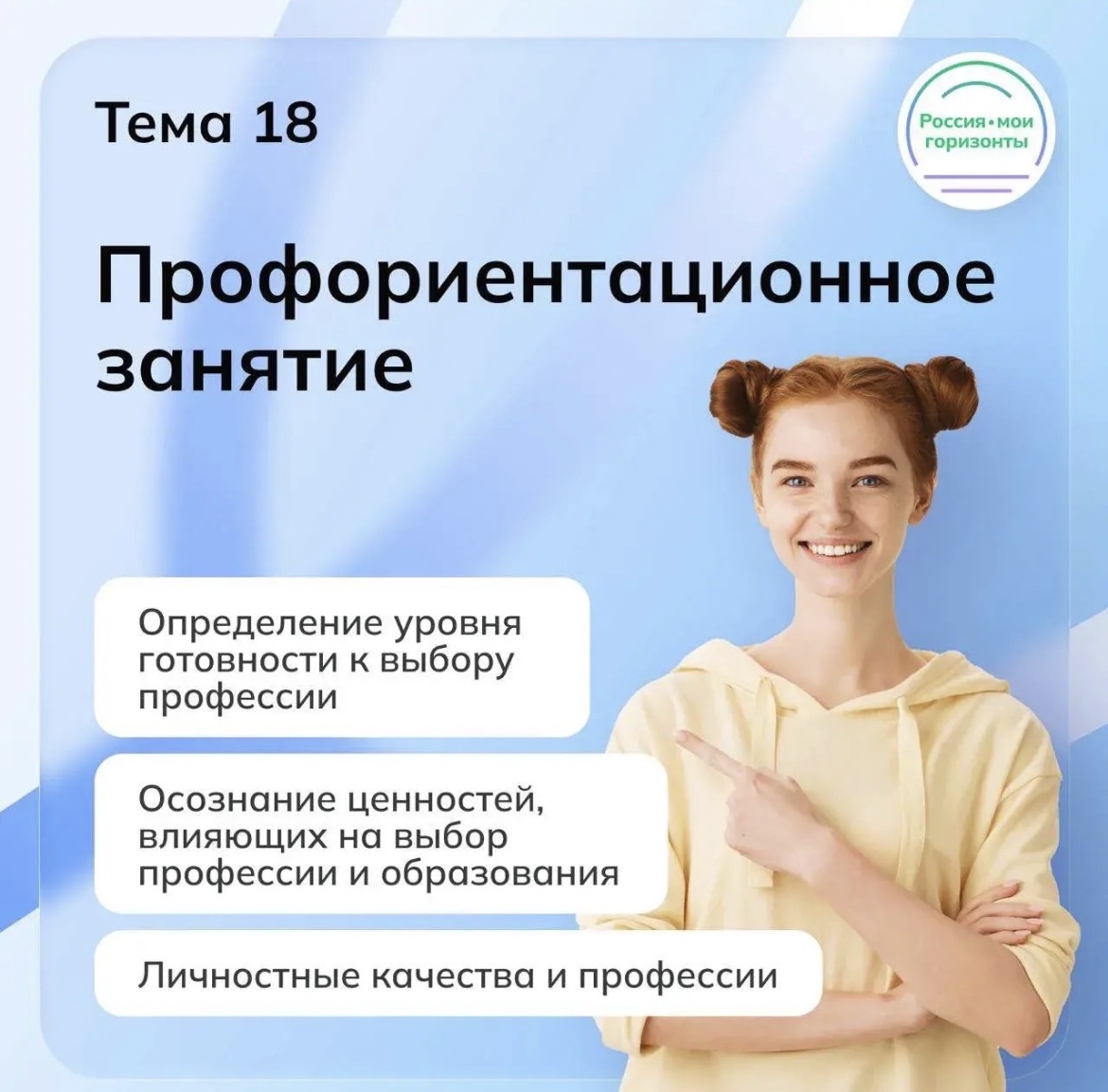 22 января 2026 года состоялось очередное внеурочное занятие "Россия - мои горизонты". В 6, 8 и 10 классах состоялось занятие по теме «Моё будущее», посвящённое личным и профессиональным качествам. Ребята подробнее познакомятся с мягкими навыками и узнают, какие профессии могут соответствовать разным наборам умений и способностей.