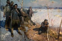 Рубрика "80 дней до Победы" Алексей Бурлай "Земля родная" (Подвиг летчика Девятаева) 1961 г. Имя летчика Михаила Девятаева еще недавно было известно только тем, кто глубоко интересуется историей. Сейчас же в кинотеатрах выходит фильм "Девятаев", и я надеюсь, что его история станет известна если не всем, то большей части нашей страны. Командир звена 104-го гвардейского истребительного авиационного полка старший лейтенант Михаил Петрович Девятаев летом 1944 года попал в плен. В феврале 1945 года он и девять других узников концлагеря на острове Узедом сумели захватить немецкий бомбардировщик и бежать. Едва не погибнув под обстрелом советских зениток, Девятаев смог посадить самолет и доставить командованию важнейшие сведения о вражеском исследовательском центре, в котором разрабатывались новые ракеты «Фау-1» и «Фау-2». Бурлай изобразил момент встречи беглецов с родной землей. С какой нежностью один из солдат нюхает землю, а другой обнимает тонкую березку. Бывшие узники смотрят вокруг, не веря своим глазам и счастью, а сам Девятаев уже устремляется вперед — помочь советскому руководству, передать важную информацию. На одежде героев нашивки OST. Такие носили все, трудившиеся на принудительных работах в Германии и в концлагерях. Это означало Ostarbeiter — "работник с востока". 31.03.2025
