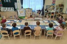 Бүген 9 нчы «тугры дуслар» кече төркеменең икенче төркемендә "кәлтәләр - бәрәнкәләр" - аппликация темасына дәрес узды. Нәниләр кызыксынып әзер формалардан композицияләр ясарга, җилем белән эшләргә, формаларны бер-берсеннән аз гына ераклыкта яки формаларны салып тезәргә өйрәнгәннәр. Кулларның вак моторикасын үстерделәр. 3-5 сарык һәм кәгазь боҗралардан (төрле зурлыктагы кәгазь боҗралардан) торган балалар зур соклану белән сый бәйләменә «тезеп» куйганнар. Бик мавыктыргыч эш булып чыкты!