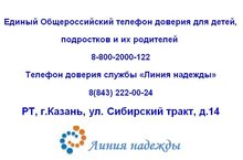 Круглосуточная медико-психологическая служба «Линия надежды» (отделение медико-психологической помощи) является отделением ГАУЗ «Республиканская клиническая психиатрическая больница им. акад. В.М. Бехтерева» МЗ РТ. Отделение создано с целью оказания высококвалифицированной медико-психологической, кризисной и суицидологической помощи. Помощь осуществляется медицинскими психологами, врачами-психотерапевтами, врачами-психиатрами круглосуточно по Телефону доверия и в онлайн-чате официального сайта, а в дневное время - на амбулаторном приеме. https://vk.com/wall663898630_663