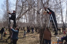На "Майдане"- в березовой роще была организована еще одна акция "Каждому скворцу - по дворцу". Родители каждой группы развесили на березах по 3-5 скворечника. Данная акция вызвала восторг у детей и единение родителей. Добро пожаловать, пернатые санитары леса.