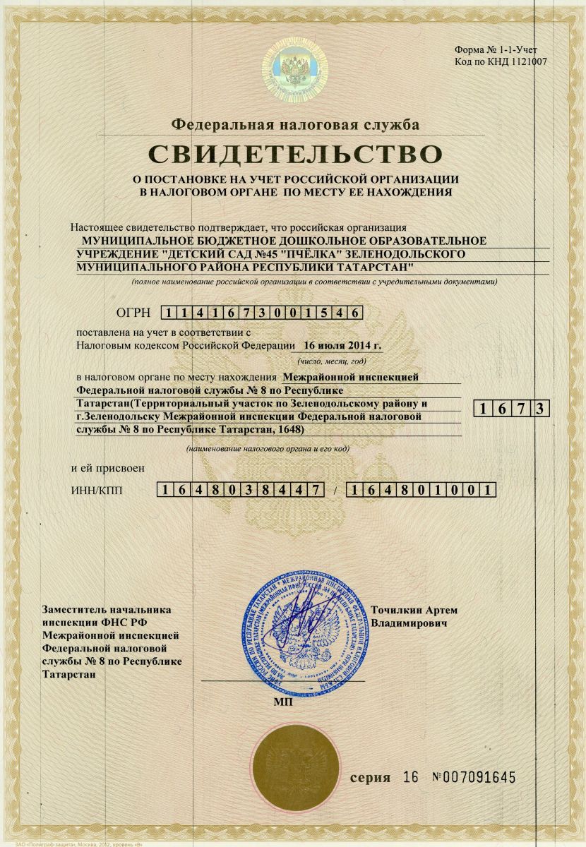 Свидетельство о постановке на учет в налоговом органе