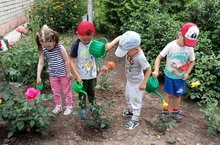 Каждый год наша территория благоухает разнообразными цветами, среди них 42 вида многолетних цветов: крокус, ландыш, магония, канны, гортензия, астильба, хоста, очиток, вербейник, лилейник, бадан, дицентра, жасмин и другие. Розарий каждый год пополняется новыми саженцами и сейчас на территории ДОУ 70 роз. Среди них 3 разновидности: почвопокровные, кустовые и плетистые. Ухаживать за цветами нам помогают даже самые маленькие наши воспитанники. В них мы стремимся развить способность видеть красоту окружающего мира, способность к творчеству, искусству и созиданию.