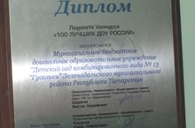 Наш детский сад стал лауреатом конкурса "100 лучших ДОУ России". Конкурс был организован Всероссийским образовательным форумом "Взгляд в будущее, проблемы и перспективы развития дошкольного образования в России". Санкт-Петербург 2014 г.