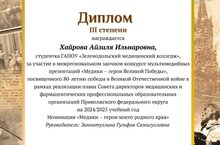 Студентка первого курса Хайрова Айзиля, под руководством преподавателя Гульфии Самигулловны Зинатуллиной, завоевали почетное 3 место в Межрегиональном конкурсе, посвященном 80-летию Победы - "Медики - герои родного края"!