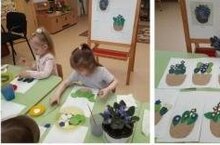 Во второй младшей группе прошло познавательное занятие по аппликации на тему "Фиалка". Дети узнали, из каких частей состоит растение, им надо вода, тепло, свет- чтоб росли и цвели. Ребята старательно клеили яркие цветы и зелёные листья, "высаживая" в красивые горшочки. Такие занятия развивают мелкую моторику и воспитывают любовь к растениям
