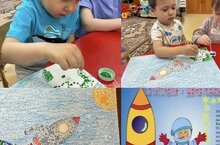 Ребята из группы «Теремок» сегодня беседовали о космосе: мы живем на планете Земля, что в космосе есть солнце, которое освещает и греет всех, а на ночном небе много звезд, а потом все вместе сделали такую работу «Ракета летит в космосе».