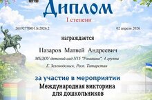 Воспитанник группы "Пчёлки", Назаров Матвей принимал участие в Международной онлайн викторине "Путешествие по России" и показал отличные результаты.