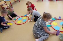 "Солнечные зайчики" Радуются весне: беседовали о приходе весны и ее проявлениях,попрыгали через лужи, собрали солнцу солнечные лучики и разные цветы из лепестков"Кояшлы куяннар" язга шатланалар: яз килүе һәм аның күренешләре турында сөйләшәләр,сулык аша сикерәләр, кояш нурларын һәм төрле чәчәкләрне яфраклардан җыялар -