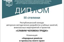 Уку дәресләренең, класстан тыш чараларның һәм проектларның авторлык методик эшләнмәләренең " Хезмәт кешесенә дан!" исемле республика конкурсы нәтиҗәләре буенча "Туган ягымның халык һөнәрләре һәм кәсепләре" номинациясендә 3 дәрәҗә дипломына 4 нче төркем тәрбиячеләре Макарова Л.В. һәм Дәүләтхуҗина Г. И. лаек булды. Котлыйбыз!