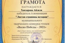 Поздравляем Ханзарову Айзилю с победой в номинации «Листая страницы истории». Айзиля принимала участие в муниципальном конкурсе чтецов «Весна Победы».