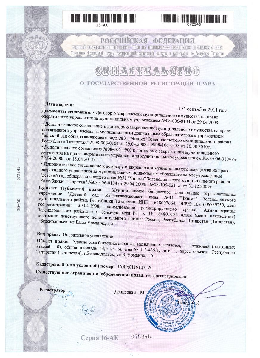 | Короткое название: | МБДОУ "Детский сад общеразвивающего вида №31 "Чишмэ" ЗМР РТ |