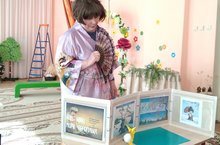 На фотографии воспитатель Сайфутдинова Л.Д. представляет театр Оригами.