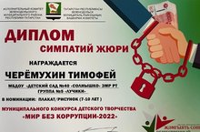 5 нче номерлы "Лучики" компенсация юнәлешендәге төркем тәрбиячесе Черемухин Т. Татарстан Республикасы Яшел Үзән муниципаль районы Иҗтимагый советы ярдәмендә "Коррупциясез Дөнья - 2022" балалар иҗаты муниципаль конкурсының "Плакат/Рәсем (7-10 яшь)" номинациясендә жюри симпатиясе дипломы белән бүләкләнде. "КанцОль"компаниясе сертификаты белән билгеләп үтелде. Котлыйбыз!