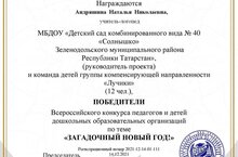 5 нче номерлы "Лучики" компенсацияләү юнәлешендәге төркем тәрбияләнүчеләре "үсеш" Мәгариф һәм фән хезмәткәрләренең "Серле Яңа Ел" Бөтенроссия конкурсында җиңү яуладылар.