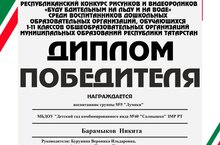 5 нче "Лучики" Төркеме тәрбияләнүчесе Никита Б. "Бозда һәм суда сак булырмын"республика конкурсында җиңүче булды.