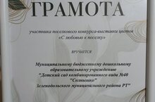 Балалар бакчасы "поселокка мәхәббәт белән" поселок конкурс-күргәзмәсендә катнашты. Эко реклама һәм Гыйззәтуллин Әмир гаиләсенең һәм Гордеева Виктория гаиләсенең тематик эшләре тәкъдим ителде. Шулай ук чыгарылыш сыйныф укучыларыбызның "сәнгатьтә чәчәкләр" иҗади картиналары. Шукюров Богдан гаиләсе "Эко-могҗиза"бистә конкурсында катнашты.
