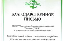 Детскому саду вручено благодарственное письмо от компании "Экотрейд" "За активное участие по сбору вторичного сырья" - макулатура (88кг.) и отработанные батарейки (44 кг.)