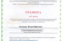 Балалар бакчасы педагоглары -Тихонова Ю.Р., Бурунина В. И. "Иң яхшы дидактик уен / мәктәпкәчә яшьтәге балалар өчен "Балачак юлы - яшел төс" дидактик уен / уен әсбабын эшләү " республика конкурсында "Иң яхшы макет уены" номинациясендә 1 урын яуладылар. Котлыйбыз!!!