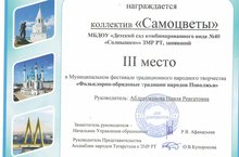 Воспитанники подготовительной группы №4 "Город мастеров" стали призёрами муниципального фестиваля традиционного народного творчества "Фольклорно-обрядовые традиции народов Поволжья" - 3 место. Поздравляем!!!