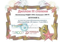Завершился Республиканский конкурс рисунков в проекте Эковесна и 75-летие Победы от Министерства экологии и природных ресурсов РТ. Воспитанники детского сада №40 "Солнышко" - Бурунина А. и Тихонов К. приняли участие в конкурсе. Отмечены дипломами участников. Всего приняли участие боле 1100 рисунков ребят со всей Республики Татарстан.