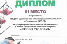 40-нчы номерлы "Солнышко" балалар бакчасы ике ай дәвамында Яр Чаллы шәһәрендә "Кошлар ашханәсе" дигән шәһәр экологик конкурсында катнашты. Балалар бакчасында экологик юнәлеш буенча Материал төрле формада тәкъдим ителде. Бу конкурста 60 тан артык белем бирү учреждениесе катнашты Татарстан Республикасы мәгариф һәм. Конкурс жюрие педагогик коллектив эшен югары бәяләде һәм 3 урын өчен Диплом белән бүләкләнде. Котлыйбыз!