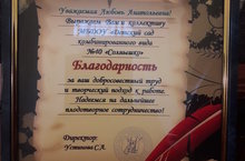 Детскому саду №40 "Солнышко" вручена благодарность за добросовестный труд и творческий подход к работе от МБУ "Музейное объединение ЗМР" Мемориального музея