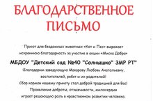 Детскому саду №40 "Солнышко" вручено благодарственное письмо за организацию акции для приюта "Кот и пёс".