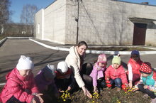 На участке детского сада с ребятами наблюдали за весенними первоцветами - мать-и-мачеха.