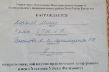 Поздравляем Королева Макара с успешным выступлением на межрегиональной конференции имени У.Ф.Хасанова.Руководители Мухаметзянова Г.Ф. и Баталова М.М.
