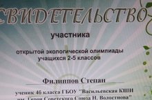 Филиппов С. ученик 4 б стал участником республиканской экологической олимпиады 23.04.2018