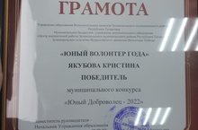 8 а сыйныф укучысы Якубова Кристинаны, "Җиңү волонтерлары ВСОШ 2" мәктәп отряды командиры, "Яшь волонтер-2022" конкурсының муниципаль этабында гранприның мактаулы призы белән котлыйбыз