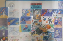 В фойе школы прошла выставка рисунков "Дорога в космос", посвященная Международому Дню космонавтики