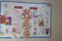 В фойе школы прошла выставка рисунков , посвященная 8 марта