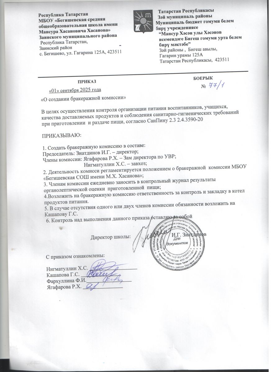 Приказ о создании комиссии по контролю за организацией и качеством питания