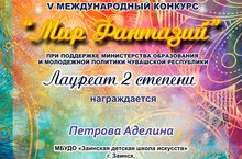 V Международный конкурс «Мир Фантазий» при поддержке министерства образования и молодёжной политики Чувашской Республики прошёл в октябре 2015 г. Обучающаяся Петрова Аделина успешно выступила в номинации «Инструментальное творчество» и награждена дипломом лауреата 2 степени (педагог Котельникова Е.В.) Поздравляем!!!